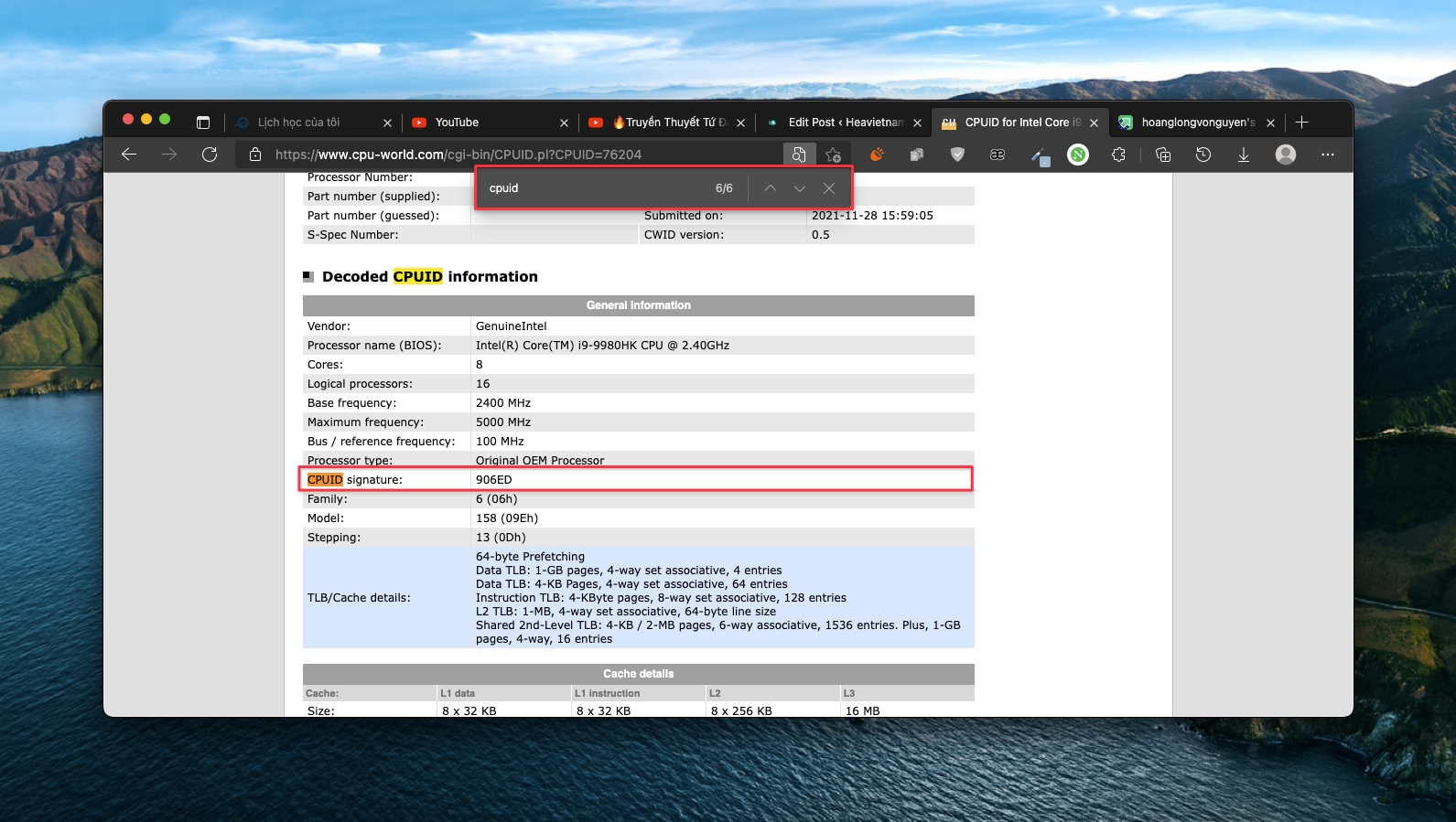 // ví dụ như cpuid của con i9-9980HK sẽ là